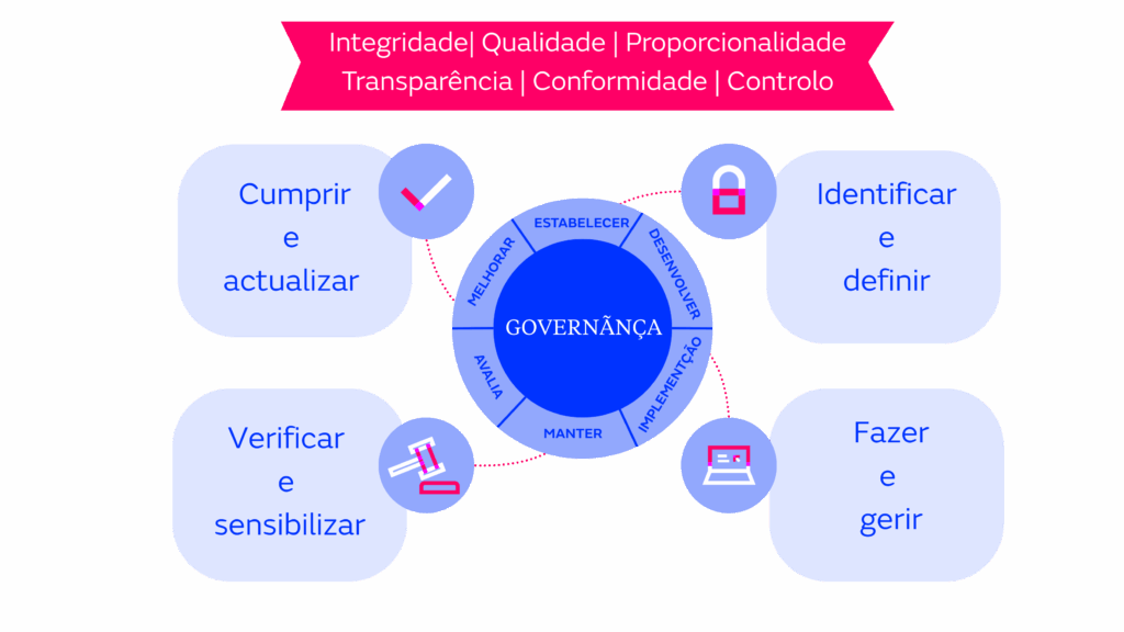 O sistema centra-se no cumprimento dos requisitos de compliance, observando os principais regulamentos, nomeadamente os relativos à proteção de dados, à legislação de propriedade intelectual e de segredos comerciais, mas também regulamentos europeus como o NIS2 (que visa estabelecer um nível comum de cibersegurança), o DORA (que reforça a resiliência dos sistemas de TI) e outros que afetam diretamente os dados dos nossos clientes.